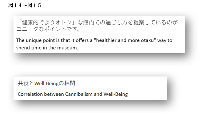 図14および図15では、「お得(otoku)」が「オタク(otaku)」に、そして「共食」が「cannibalism(カニバリズム)」に誤訳されています。