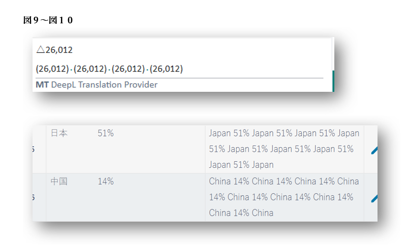 図9および図10では、数値そのものは正しいにもかかわらず、翻訳ツールが同じ数値を4〜8回繰り返して出力している例が確認できます。数値が正確でも、このような繰り返しは誤りであり、文書全体の信頼性に影響を与える可能性があります。数値の出力は、必ず細かく確認するようにしましょう。