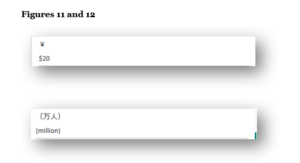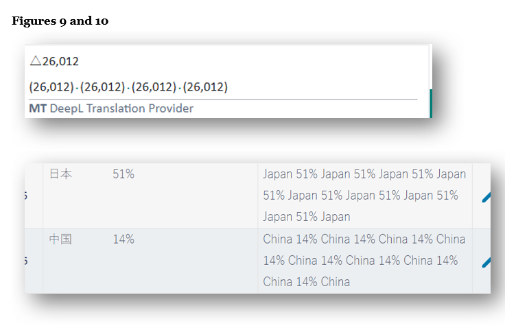 Figures 11 and 12 show more serious mistranslations: ¥ converted to “$20,” and 万人 translated as “million people.” These are easy to catch in isolation but could easily be missed in a lengthy financial report, especially if only the English output is reviewed for grammar, word choice, and natural language use.