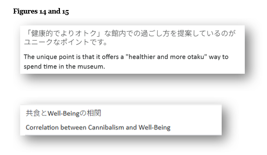 Figures 14 and 15 here depict “otoku” translated as “otaku” and 共食 translated as cannibalism. I probably don’t have to explain why this is wrong. Mistakes like these are potentially embarrassing.